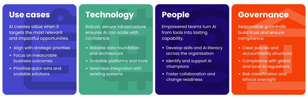 AI only delivers lasting impact when it is tied to real business outcomes. Start by aligning initiatives with strategic priorities and measurable goals, whether that’s reducing call resolution times, improving throughput, or cutting error rates. Prioritise quick wins that demonstrate value early, while designing solutions with scalability in mind.