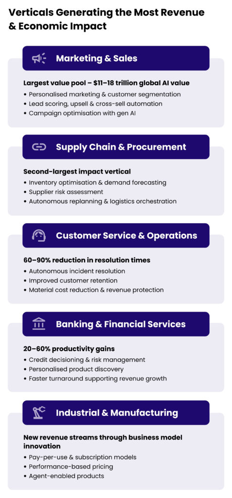 Vertical use cases tell a different story. These are embedded in core business functions and processes and can deliver measurable economic impact. But scaling them has been hard: less than 10% of such initiatives make it past the pilot stage. Even when deployed they often only address a narrow step in a process and require human prompting rather than operating proactively or autonomously. So, their impact on overall business performance is far below what’s possible.